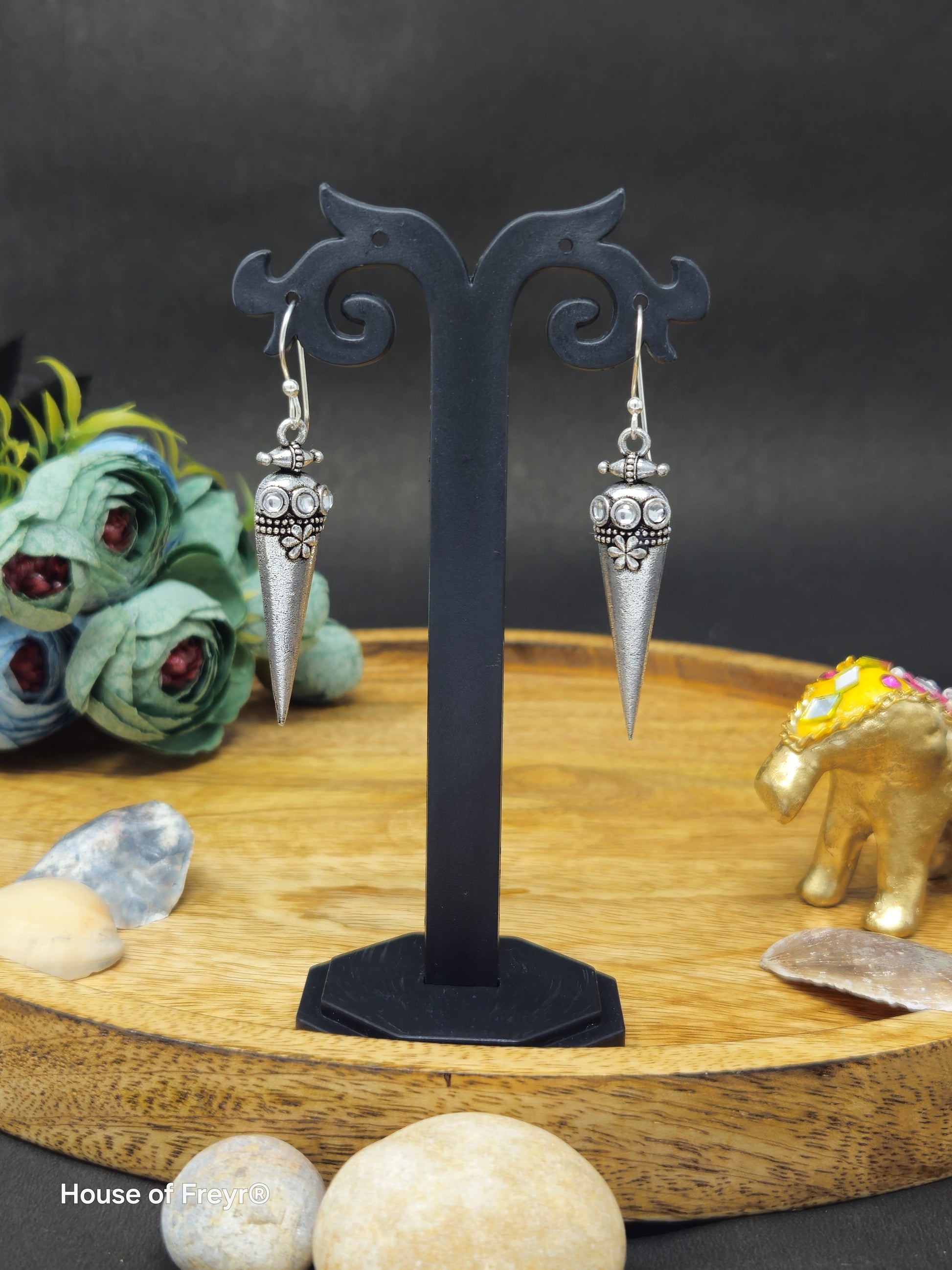 Discover a unique blend of vintage elegance and tribal craftsmanship with these Cone-Shaped Oxidized Silver Hook Earrings from House of Freyr. Featuring a distinct elongated cone design, these earrings are adorned with intricate beadwork and multicolor stone accents in rich shades. The oxidized silver finish enhances the antique appeal, making them the perfect accessory to add a bold, ethnic touch to any ensemble. Their lightweight build ensures comfort, allowing you to flaunt these statement pieces effortlessly from day to night.